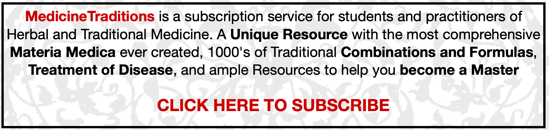 MedicineTraditions is the home of Traditional Medicine … a wealth of information gathered from the 4 Great Medical Traditions of the Silk Road … an enormous amount of information including Materia Medica of Vegetable, Animal & Mineral medicines, ‘s of Traditional Combinations & Formulas, a Huge Database of Diseases & Treatments, lots of Articles & resources to help you become a Master of Traditional Herbal Medicine | What is Medicinetraditions? MedicineTraditions is the most awesome resource for the Study and Practice of Traditional Herbal Medicine. It focuses on the 4 Great Medicine Traditions along the Silk Road which had a huge impact upon one another and share basic theory and Materia Medica. Who Is MedicineTraditions For? MedicineTraditions is primarily aimed at Students and Practitioners of Herbal and Traditional Medicine. What’s Inside MedicineTraditions? Inside MedicineTraditions you will find many ‘s of Medicine Monographs of Vegetable, Animal and Mineral Medicines with information derived from European, Greek, Arab, Indian, Tibetan and Chinese sources, all compiled into a single, workable format. What About Animal Medicines? MedicineTraditions does not support the use of endangered animals in modern Traditional Medicine. Is Traditional Medicine Effective? Traditional Medicine has its roots in prehistoric times. Over millennia, certain herbs and formulas developed reputations for their efficacy in treating certain conditions. Many of the indications modern herbalists are taught today are uses known to ancient Greek, Indian or Chinese practitioners 1000 or 2000 years ago. Can I get treatment? MedicineTraditions is not for self-diagnosis or self treatment. Who Created MedicineTraditions? MedicineTraditions has been created by Adam Tate. How is MedicineTraditions Funded? MedicineTraditions is funded by people like you. What do I get with Subscription? MedicineTraditions has a lot of FREE content. However,