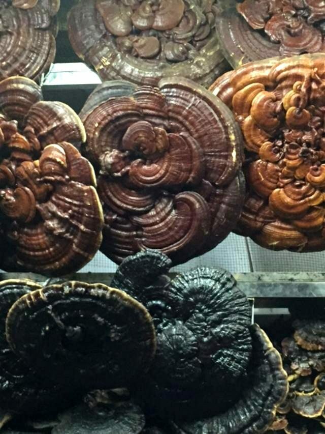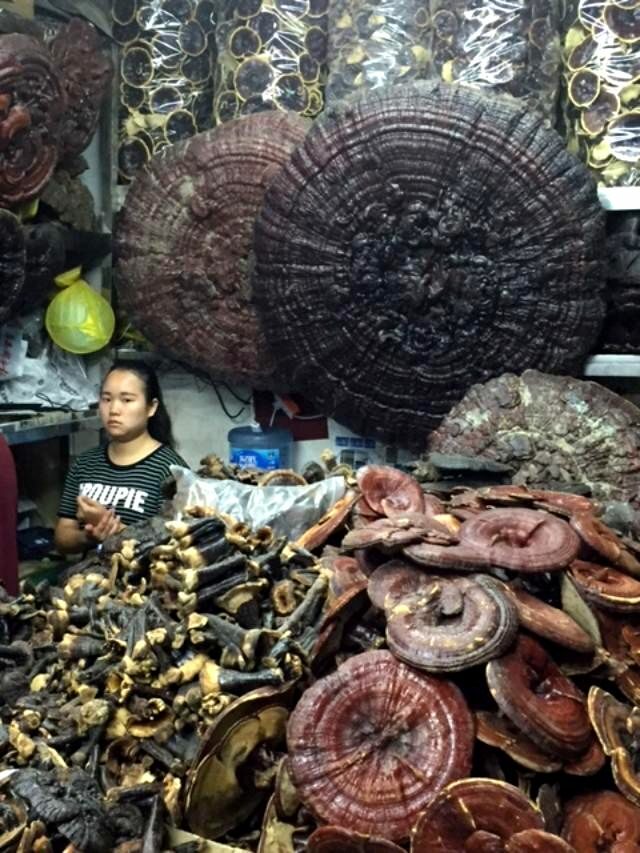 A vendor specialising in Ling Zhi and medicinal fungii at the He Hua Shi Medicine Market in Chengdu. On the left can be seen 2 massive Ling Zhi measuring well over 120cm (4 feet) across! On the right are color variations of Ling Zhi; Brown, Red, Orange and Black. These samples are also huge, being around 90cm in diameter. (Photos: Adam 2016)