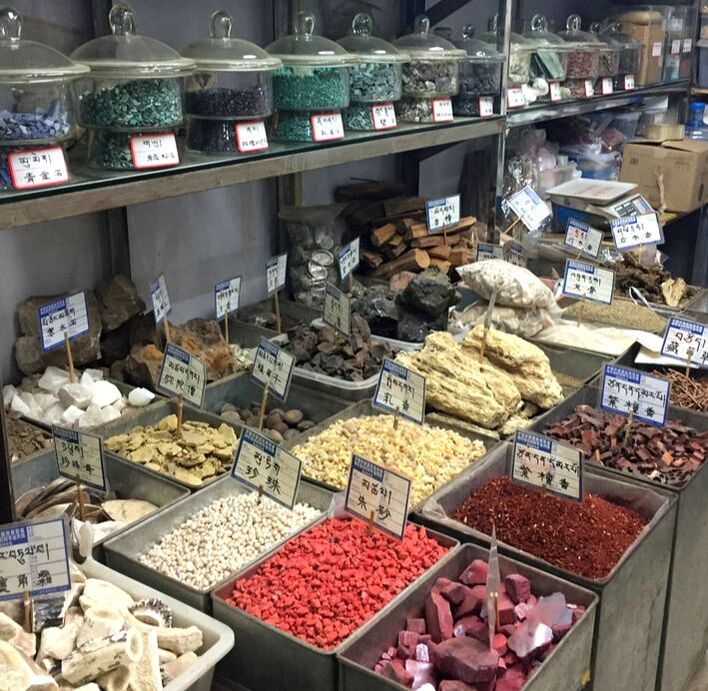 A seller at the Chengdu Medicine Market specialising in mineral medicines. The jars at top are gemstones, while Amber, Pearl, Cinnabar, Shells, Salts, Fossils, Shilajit and numerous other minerals are down below. Note the labels are in both Chinese and Tibetan, as Tibetan Medicine uses lots of mineral and gem medicines.