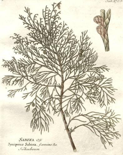 “The savin is of two kinds; one has thorny leaves like those of the Cypress and a disagreeable smell. It is round and grows more in width than in length. The other has leaves like those of the Tamarisk. This is a plant of strong desiccative qualities, cleansing dirty u!cers and is an emmenagogue. It removes unhealthy granulations and is useful to the living ones”.
