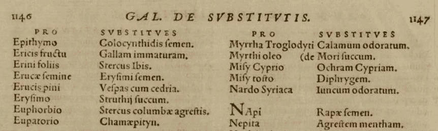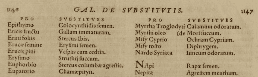 A page from a 17th century Latin text listing Substitute Medicines